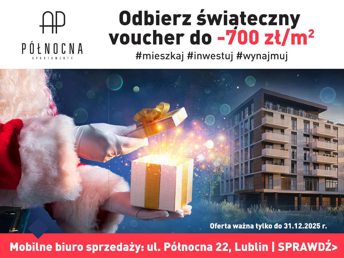 Voucher do -700 zł/m² na wybrane apartamenty dla wszystkich, którzy przyjdą do naszego mobilnego biura sprzedaży przy ul. Północnej 22 w Lublinie: