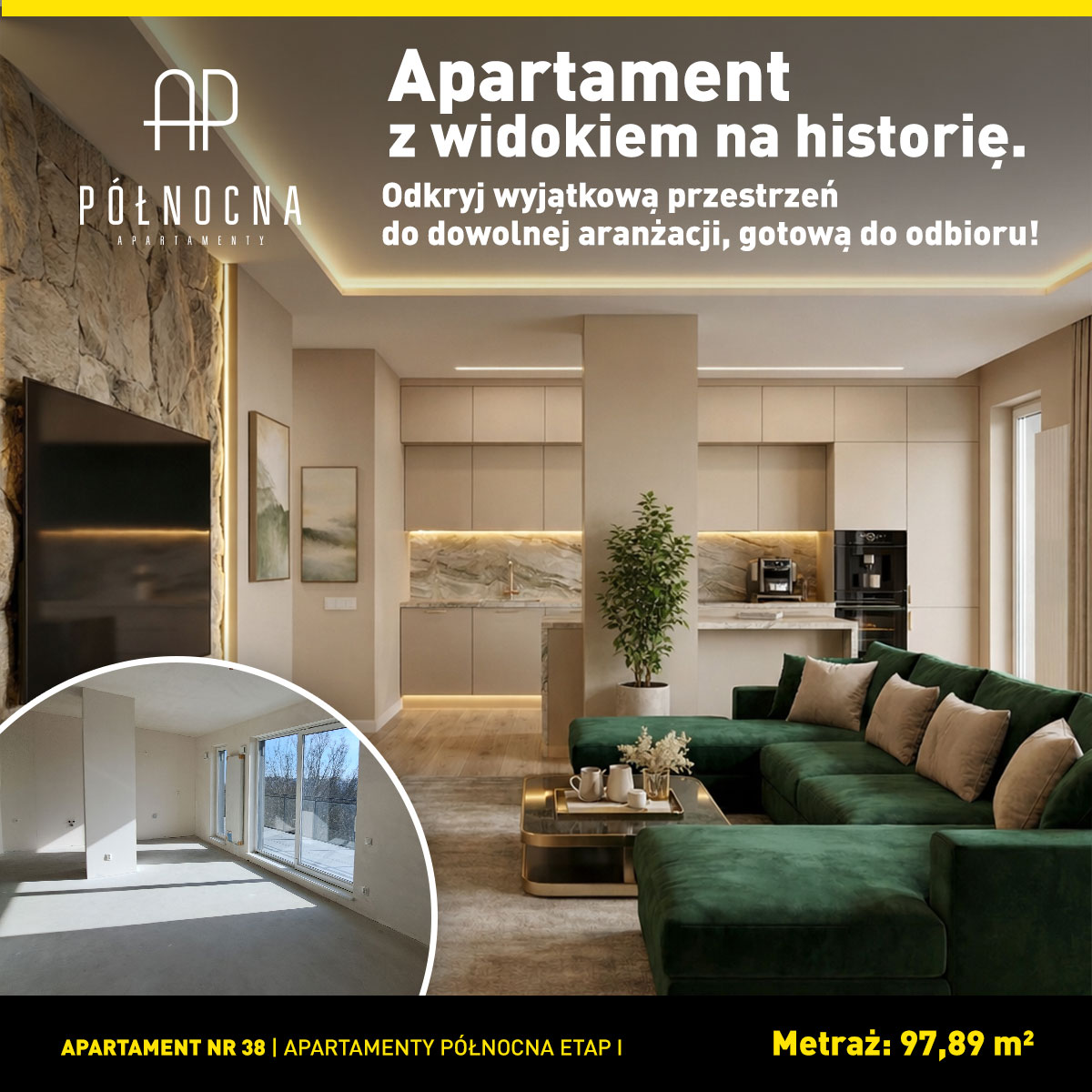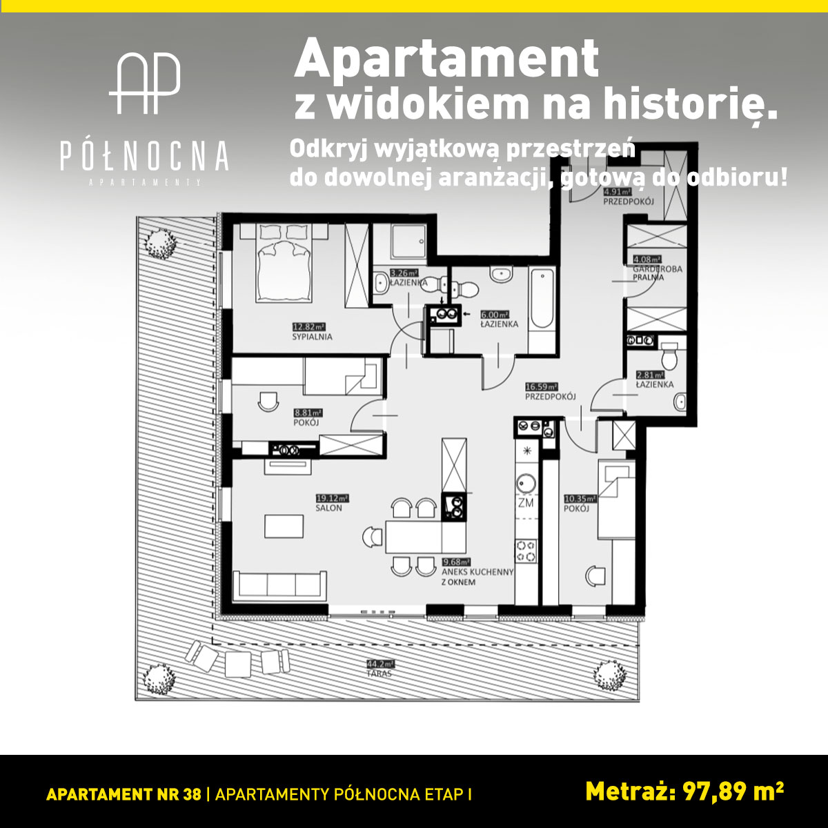 • Przestrzeń dla rodziny: Prawie 98 m² inteligentnie zaprojektowanej powierzchni (4 pokoje + aneks kuchenny), która daje nieskończone możliwości aranżacyjne.